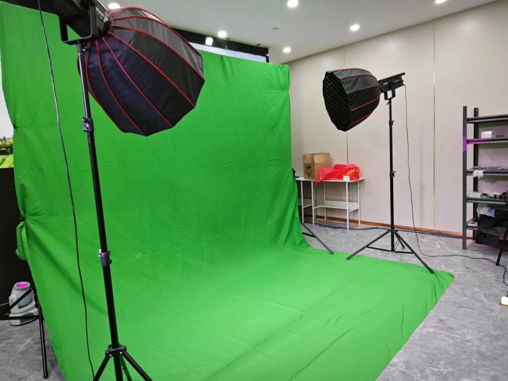 2)灯光:2个及以上100W及以上影视补光灯+深抛柔光罩(70cm+),确保有2个柔光灯用来打绿幕