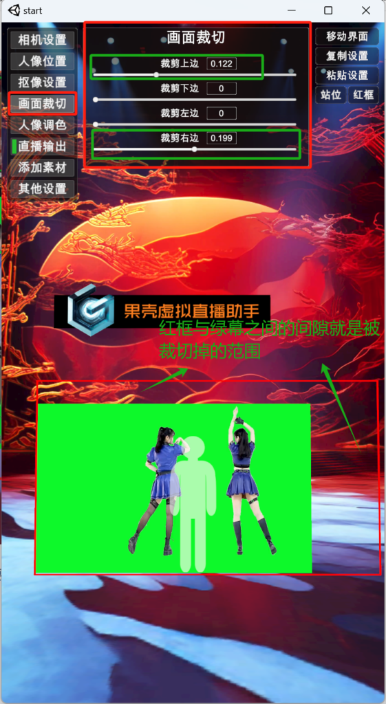 4)画面裁切:对于相机拍摄的范围,上下左右四个边有拍出绿幕范围的,或者不想要显示的,可以通过 画面裁切 进行裁切: