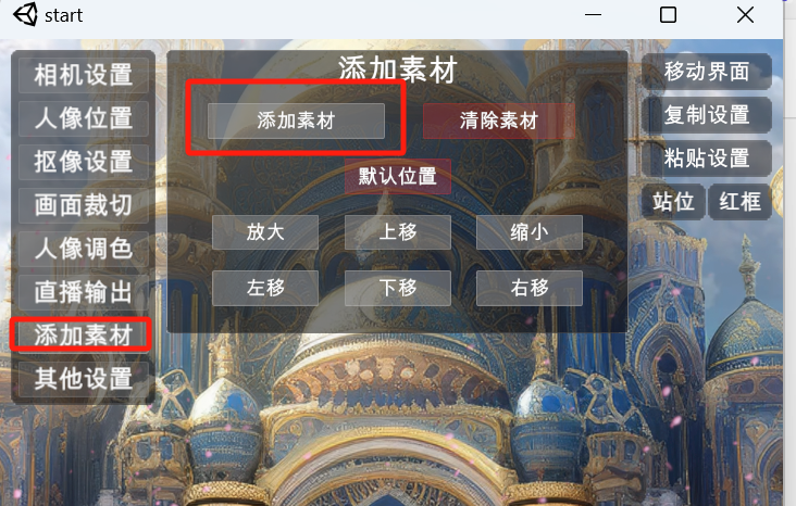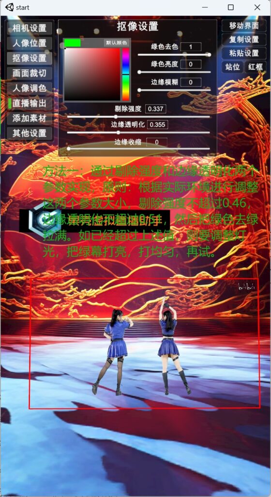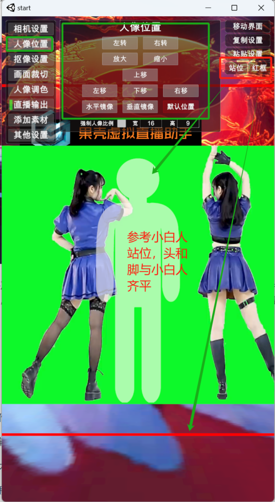 3)人像位置:点击左边菜单第二项 人像位置,可以调节 相机传入画面的 大小,位移及旋转,菜单最后边的两个按钮“站位”及“红框”,点击“站位”,弹出参考站位的小白人,人的站位建议按照 小白人的大小站位(头不要超过小白人太多,否则切换近景运镜人容易出框),调好站位后,再点击“站位”,隐藏小白人。 点“红框”按钮,显示的是相机所拍摄画面的大小范围。