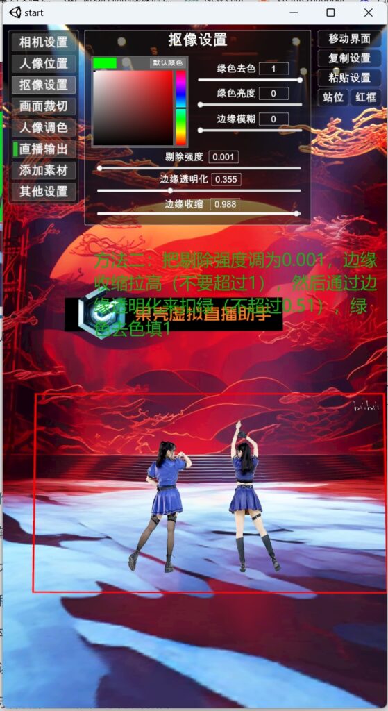 方法一:剔除强度(不超过0.46),边缘透明化(不超过0.51),绿色去绿(1),结合实际环境,调节剔除强度和边缘透明化两个参数。