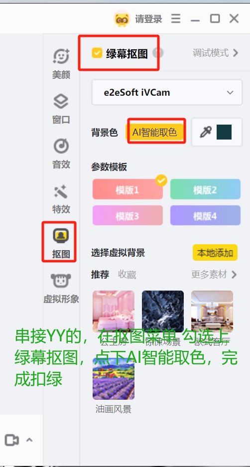 然后打开“抠像设置”菜单:主要有两种扣绿方式,参考下图1、2的参数,如串接了YY开播,则可以考虑用YY扣绿的方式,如图3所示