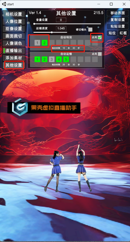 1) 如要设置自动运镜/自动特效,勾选相应位置的“启用”按钮,绿色背景的数字 表示 把该特效/运镜加入自动运行,灰色表示不参与自动运行,可以通过鼠标点击相应数字加入/退出。触发时间可以通过键盘输入,表示多长时间播放下一组特效/运镜