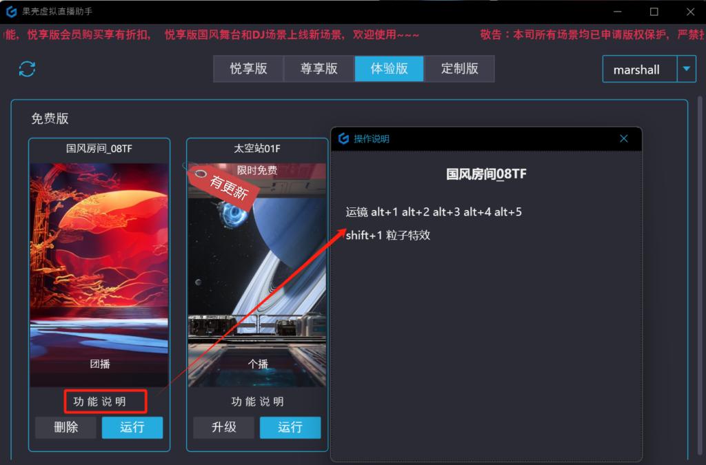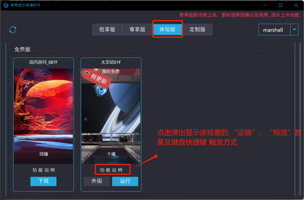 如下图所示,新用户选 体验版 进行调试体验,功能说明列出了该场景的 “运镜”及“特效” 数量及相应的键盘触发快捷键,点击 “下载” 按钮进行场景资源下载,下载完后,点击“运行”按钮运行。