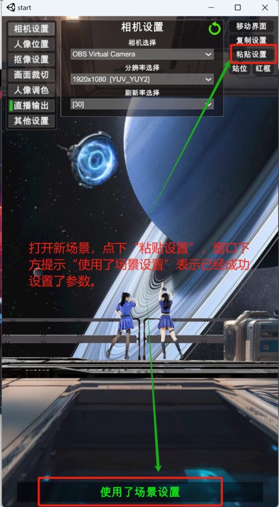 场景第一次使用需要设置,为了不重复调试参数,可以从已经设置好的场景拷贝参数到新场景中,具体做法:打开已设置好的场景,点开菜单,点下右排按钮“复制参数”,打开还未设置过的新场景,同样点开设置菜单,点下右排按钮“粘贴参数”: