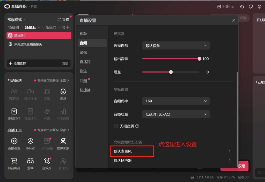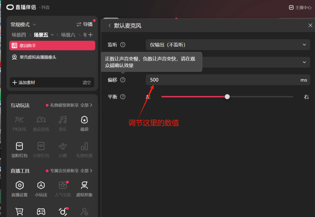 解决:在抖音直播伴侣直播设置里面,把声音延后,如下图所示:
