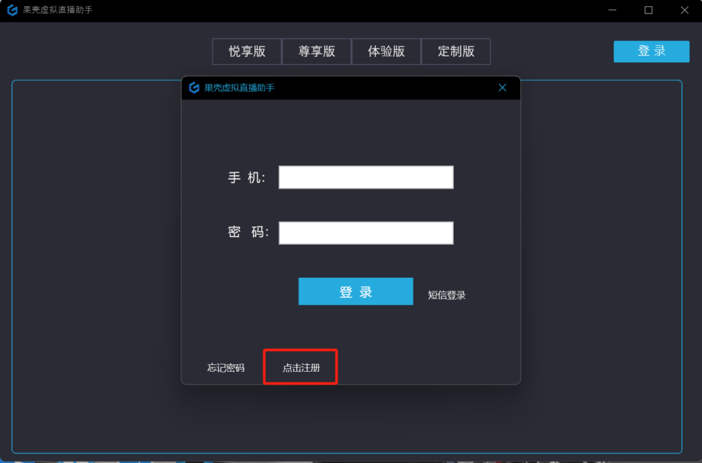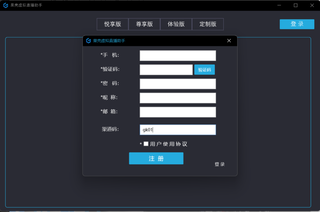 2)运行“果壳虚拟直播助手”,选择“点击注册”,进入注册页面,填入相关个人信息,完成注册,然后通过刚才注册的账号和密码进行登录。