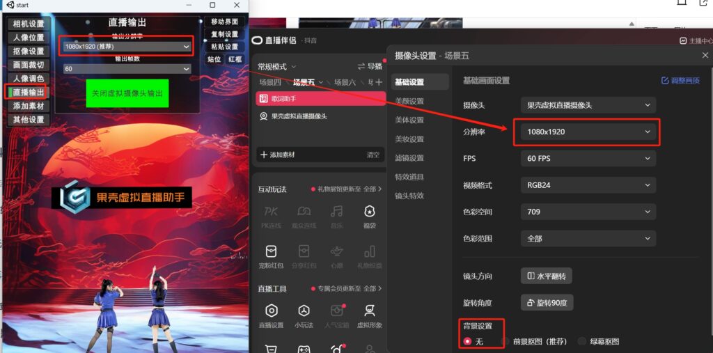 打开场景的菜单,点击“直播输出”,打开虚拟摄像机(分辨率默认设置就好),然后打开直播伴侣,添加新的摄像头,选择“果壳虚拟直播摄像头”,分辨率设置 与 果壳直播输出的分辨率必须保持一致(1080*1920)。其它平台的直播与之类似,都是添加果壳虚拟摄像头,分辨率设置为1080×1920。