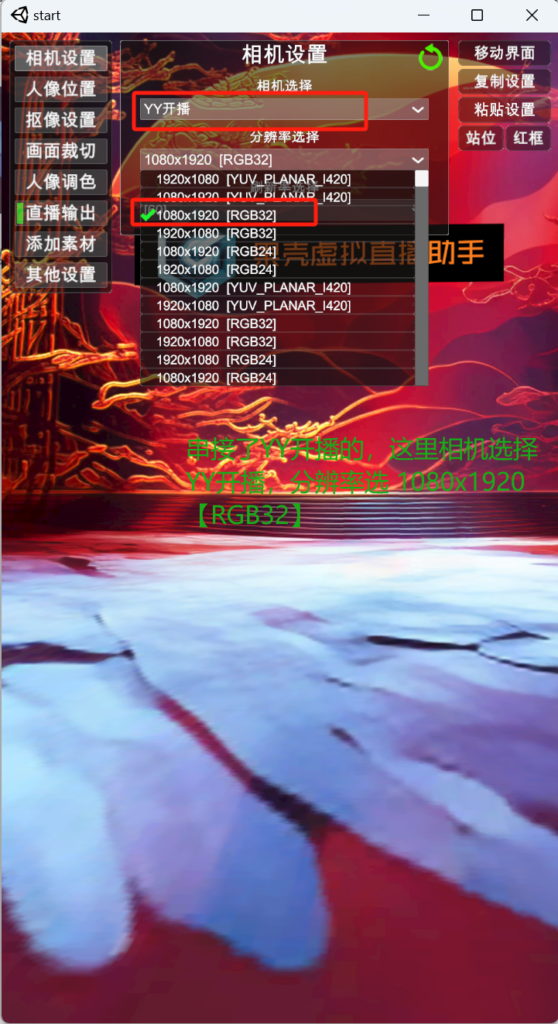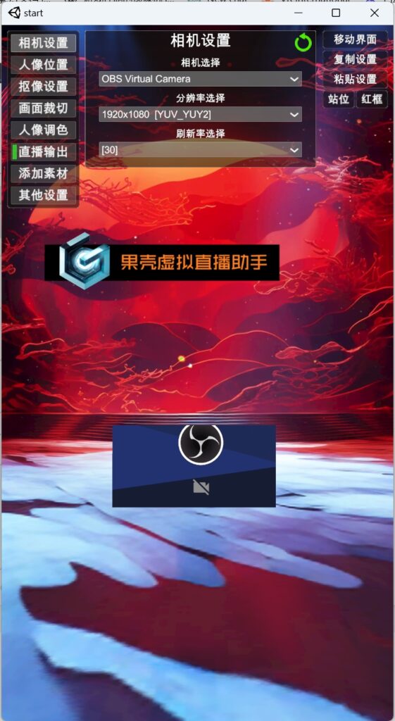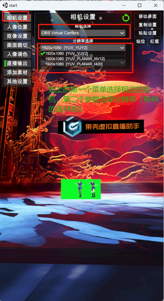 2)相机选择:点下左边菜单第一项“相机设置”,选择对应的相机(下图用了obs虚拟相机,仅是参考,选实际的物理相机,串接不需装obs),分辨率往高的选(如串接了YY开播的,则在此处选择“YY摄像头”,分辨率 1080*1920 RGB32)